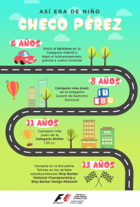 Así mismo, te compartimos una infografía de los hitos en los primeros años de carrera del piloto de 27 años, que lleva una racha de 13 carreras en zona de puntos, y fotografías de cómo fue en su infancia el mexicano que pone en alto el nombre de nuestro país en Formula 1.